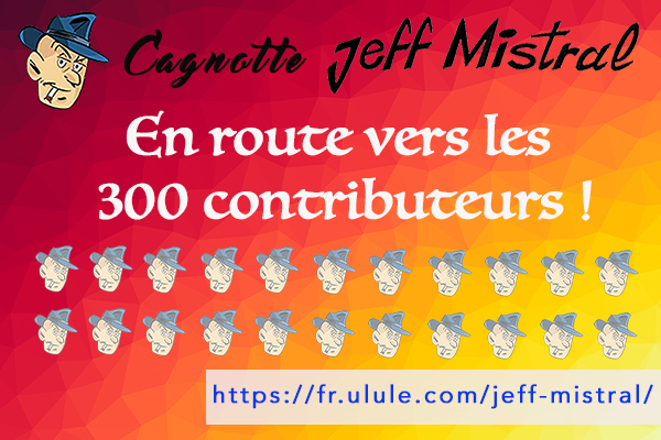 Si vous connaissez des gens qui veulent faire partie de cette belle aventure et profiter des nombreux cadeaux réservés aux souscripteurs (dédicace, sur-couverture spécifique, goodies, tirés-à-part numérotés et signés par les auteurs, poster, etc.), dites-leur de venir rejoindre l’aventure Jeff Mistral, faites connaître le projet pour aller encore plus loin ! Après le vendredi 28 juin, il sera trop tard !